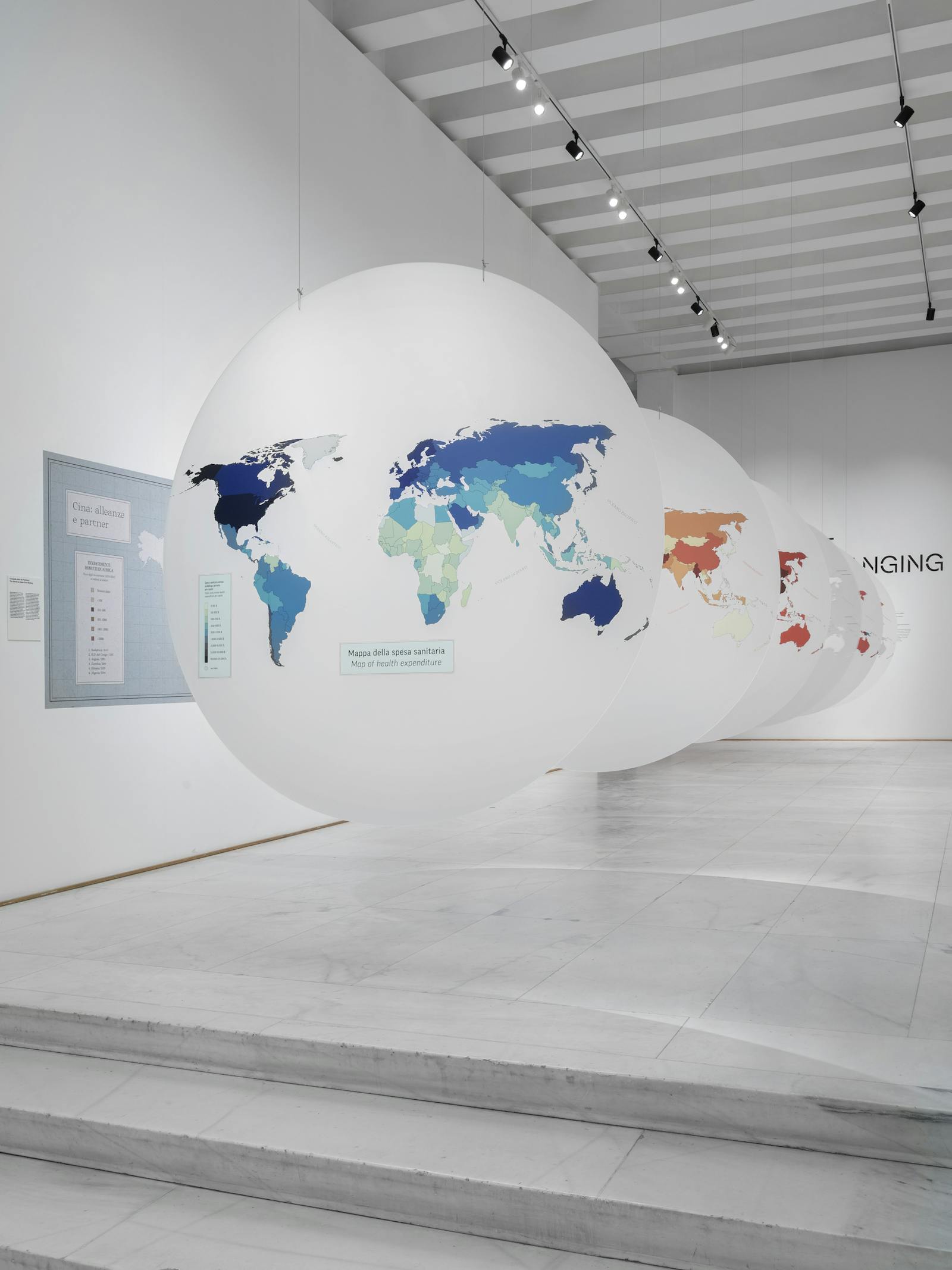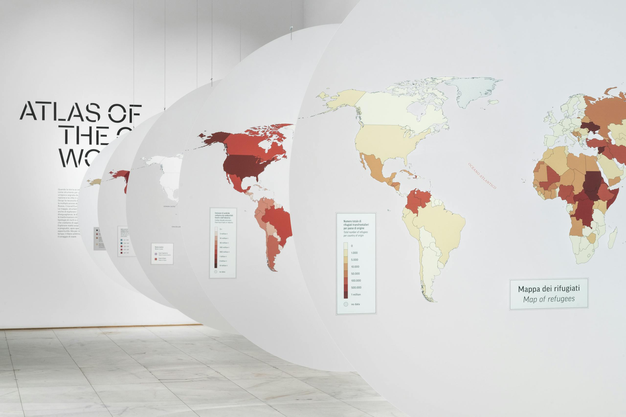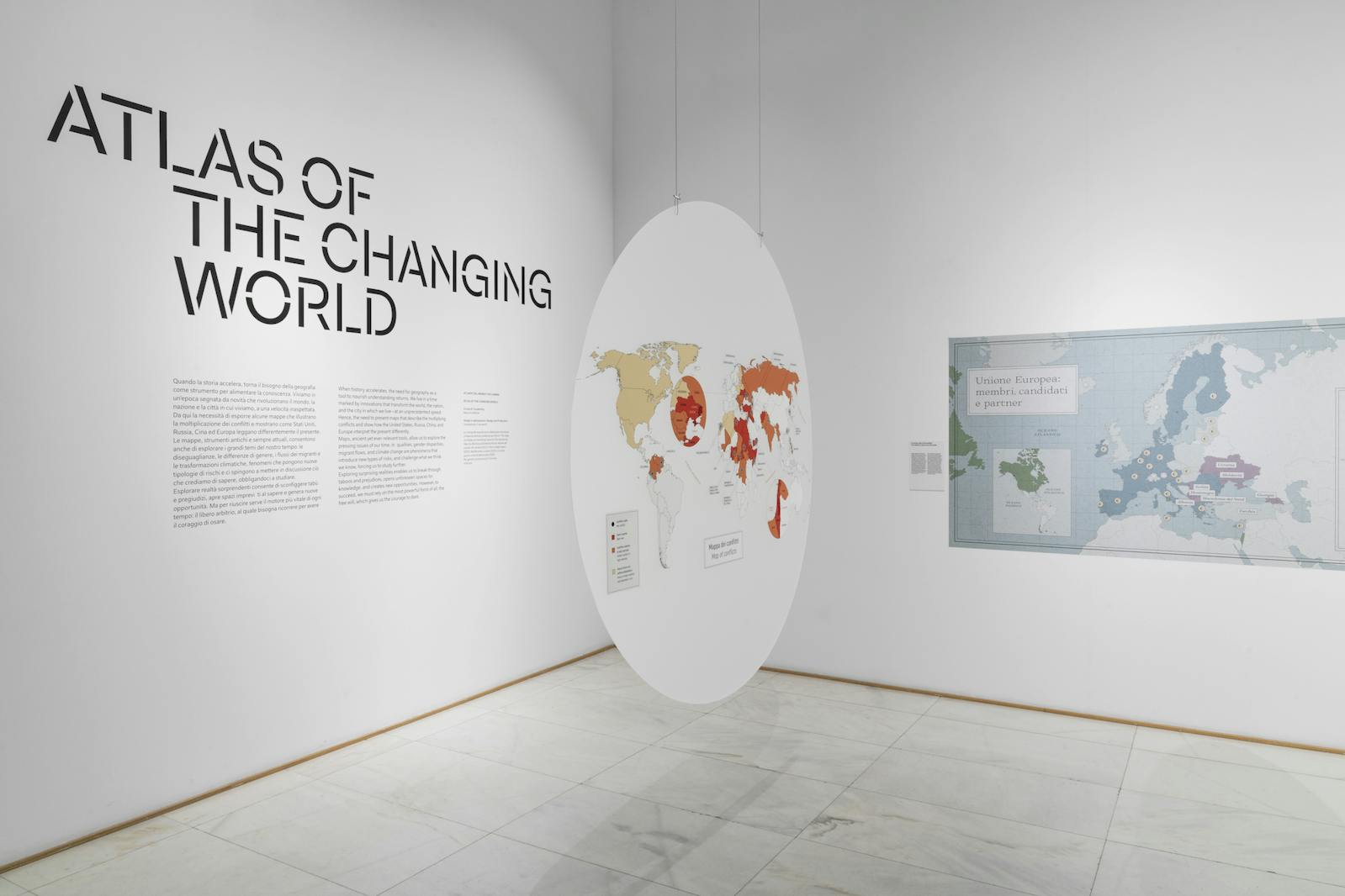 The maps on display are reworkings based on the volumes by Maurizio Molinari published by Rizzoli: Atlante del mondo che cambia (2021), Il ritorno degli imperi (2022), Mediterraneo conteso (2023), La nuova guerra contro le democrazie (2024).