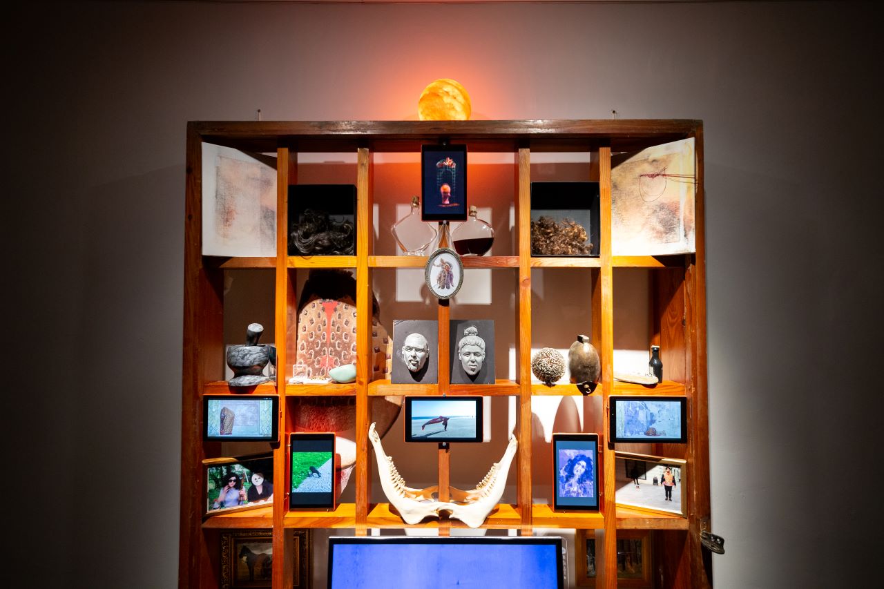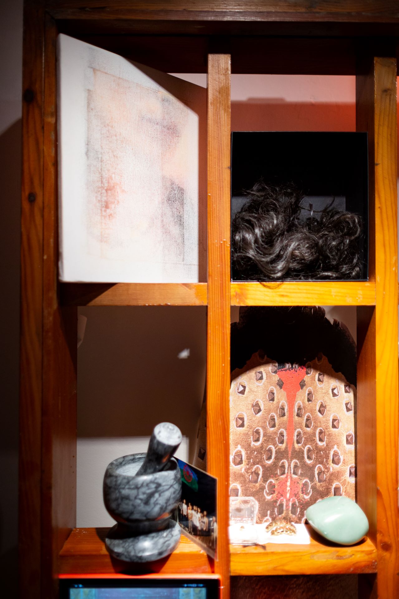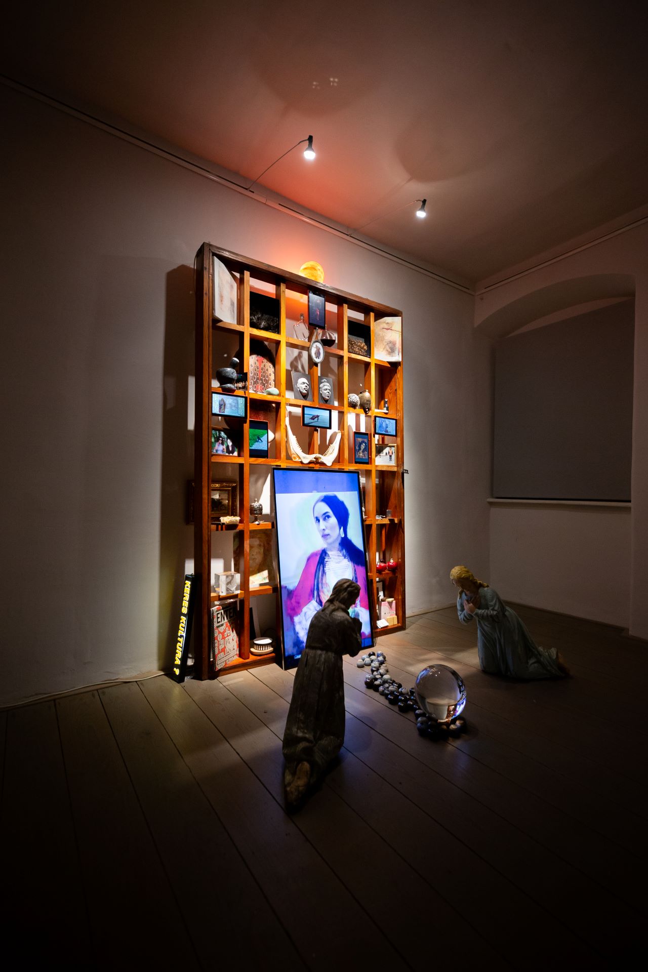 The sculptural arrangement exhibits personal items, family reliquiae, found objects, photographs, multimedia projections and artworks (in reproduction or fragments), assembled on an altar-like wooden structure. In their heterogeneity, the aesthetic weave of these elements creates an evocative and transcendental illustration of the contingent incommensurability of Roma identity.