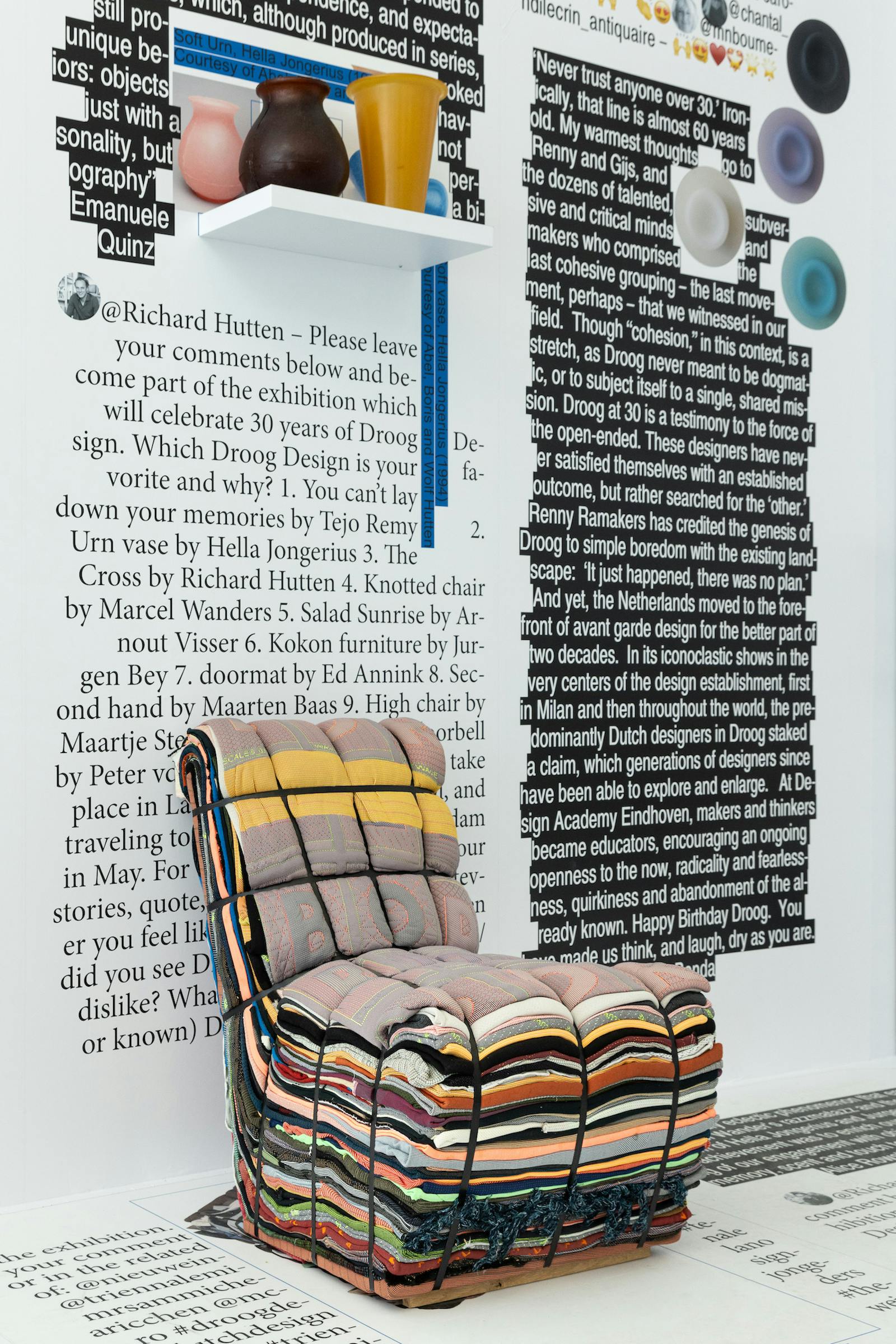 Un'esposizione coinvolgente e accogliente, che mostra come il pensiero impertinente e la pionieristica disobbedienza al design tradizionale del marchio siano diventati nel corso degli anni estremamente affascinanti e una vera e propria pietra miliare della storia internazionale del design. Dalla Cassettiera di Tejo Remi, progettata nel 1991, che eleva i cassetti trovati in quello che potrebbe essere percepito come un oggetto d'arte, alla Do Hit Chair di Marijn van der Poll, che come in una performance, viene modellata dal suo proprietario con un martello rendendo l'oggetto unico e anche molto tuo; dalla sedia Knotted di Marcel Wanders, avvolgente e dall'aspetto artigianale, progettata nel 1996, agli oggetti più recenti come la Glass Lantern del 2013 di Richard Hutten, che ha modernizzato e rimodellato una tipica lanterna di carta cinese, Droog mira a rendere straordinario l'ordinario.