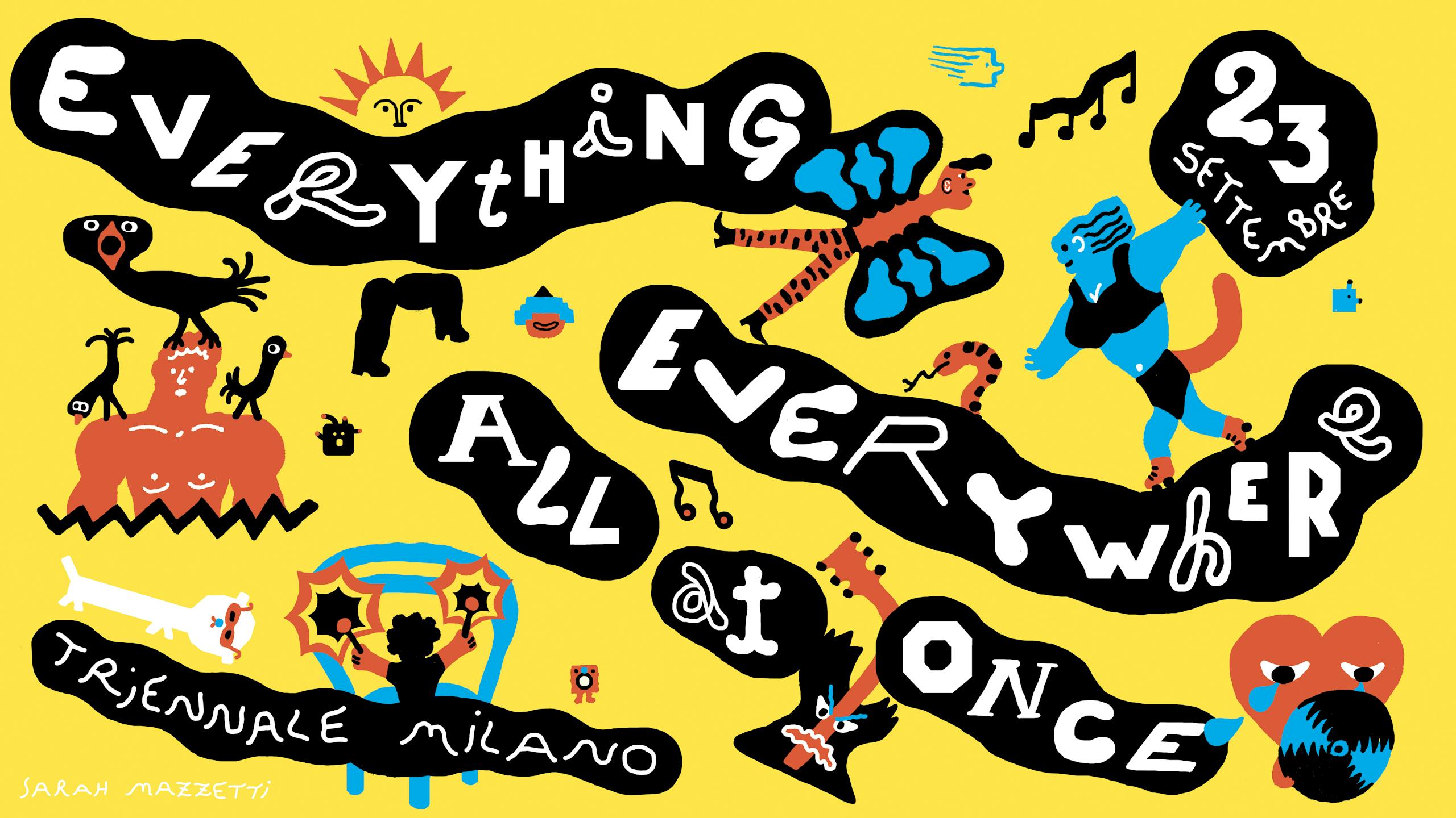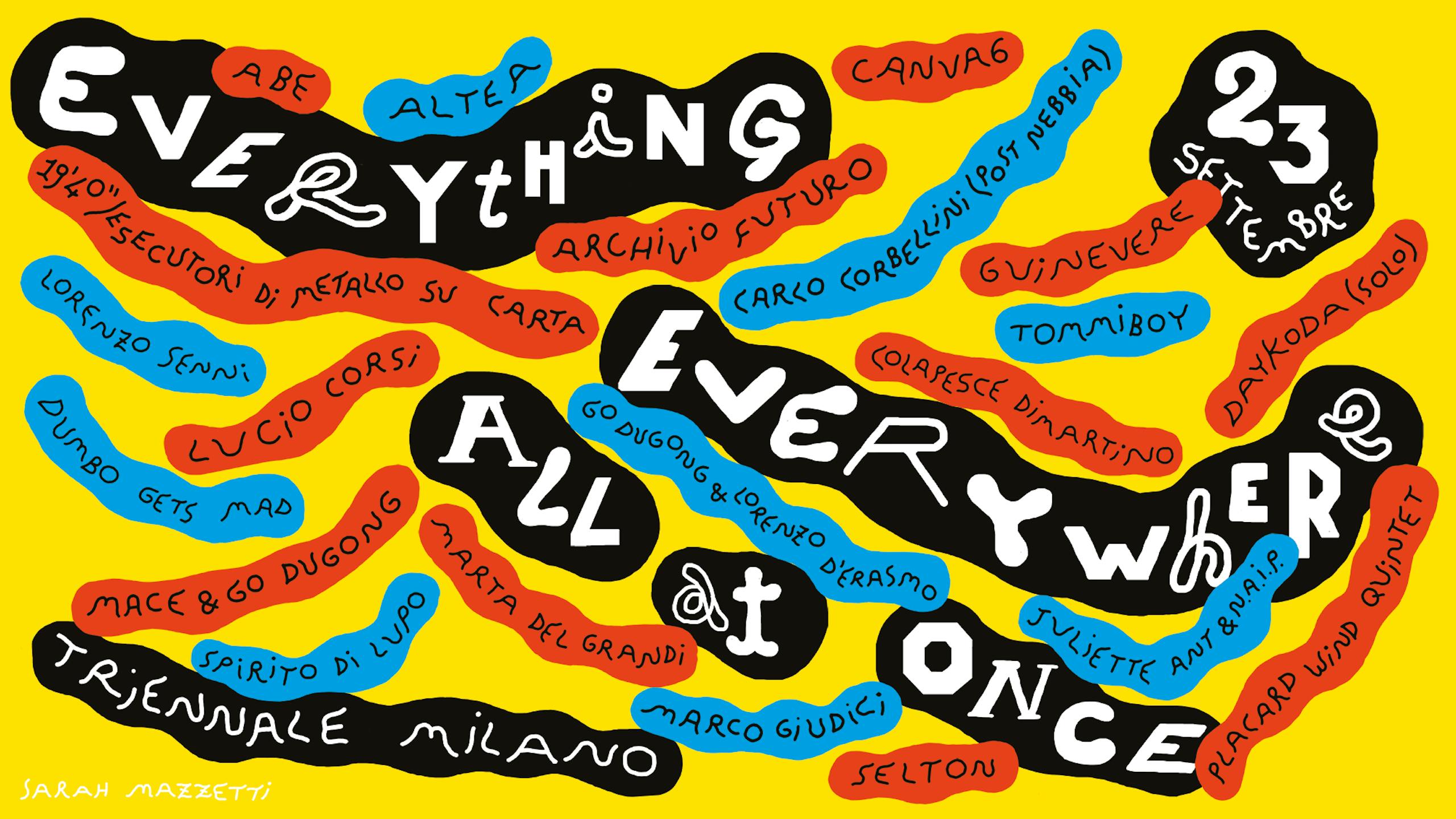 Tutto ovunque in una sola volta. Dalle 16.00 alle 02.00 una grande festa – ideata insieme a Carlo Pastore – un festival diffuso negli spazi più noti e anche in quelli mai visti di Triennale Milano, organizzato come le mattonelle luminose di un dancefloor che si accendono al passaggio, nell’idea di un flusso armonico. Un momento di celebrazione – in occasione del centenario di Triennale Milano – e di condivisione. Concerti e performance con oltre 20 artisti distribuiti dal balcone della facciata al teatro, passando dagli spazi espositivi e Casa Lana di Ettore Sottsass, senza dimenticare i bagni.